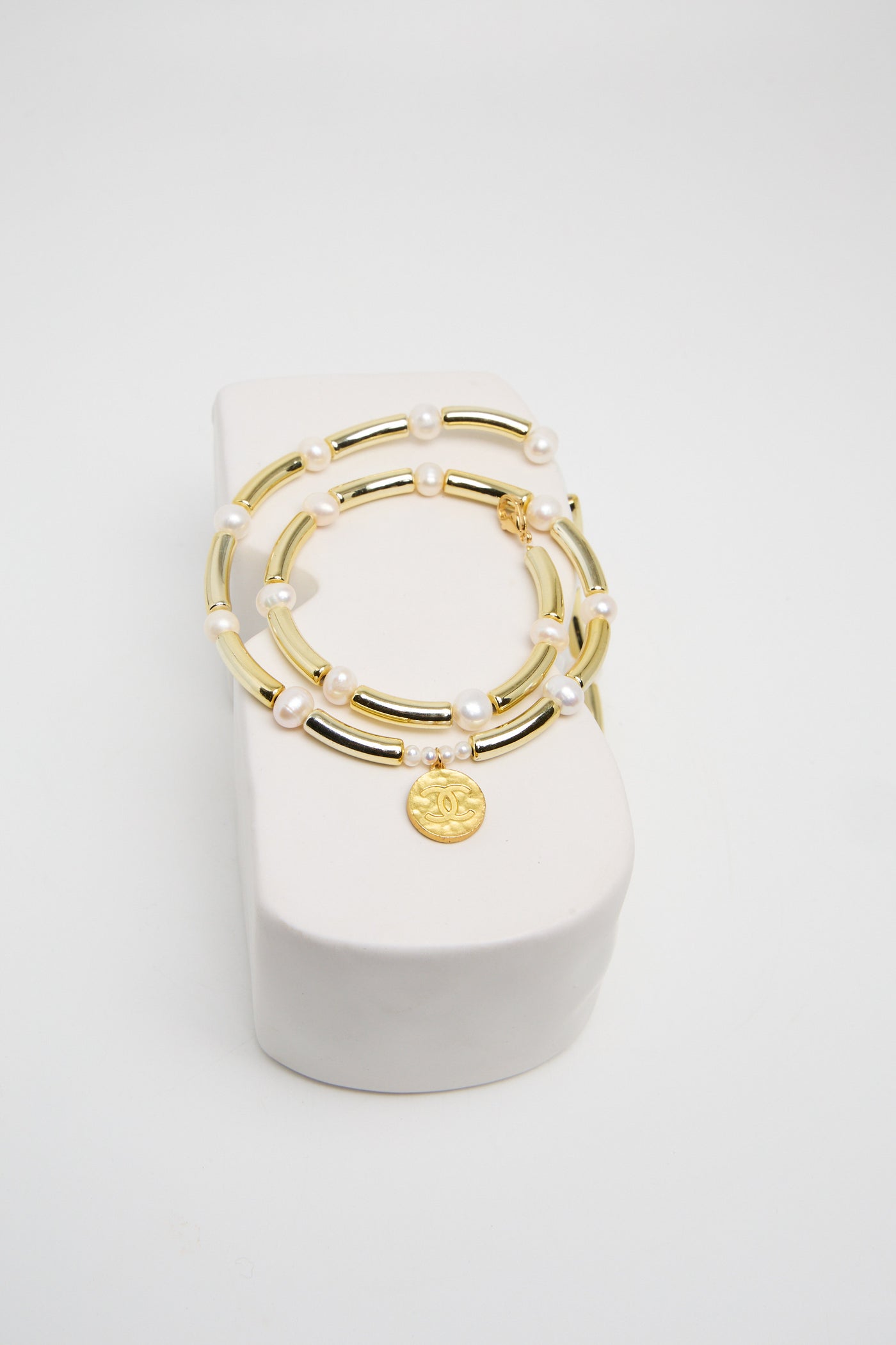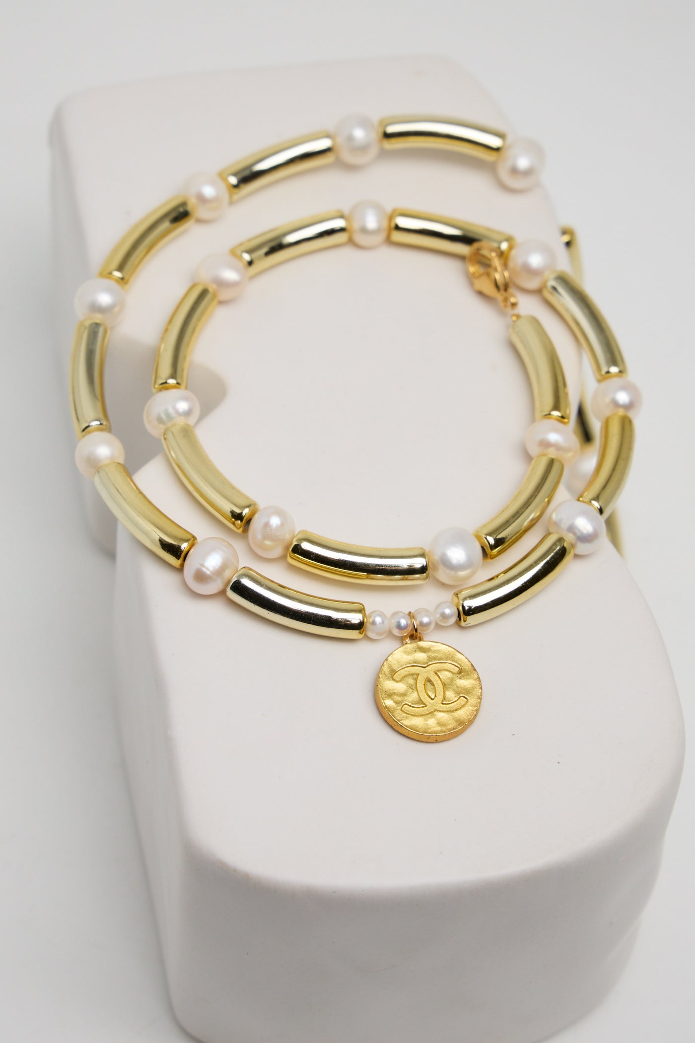 Chaîne en tubes en acrylique et perles de culture .